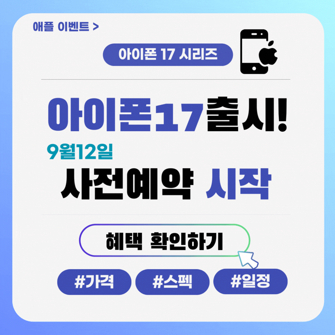 아이폰 17 시리즈는 2025년 9월 9일(화) 애플 이벤트에서 공개될 예정입니다. 본문 정보는 사용자 제공 일정에 기반해 정리되었으며, 세부 사양/가격은 행사에서 최종 확정됩니다. 공개 직후 사전예약 공지가 이어질 가능성이 높아 알림 설정 및 즐겨찾기를 통해 빠르게 참여하는 전략이 필요합니다.