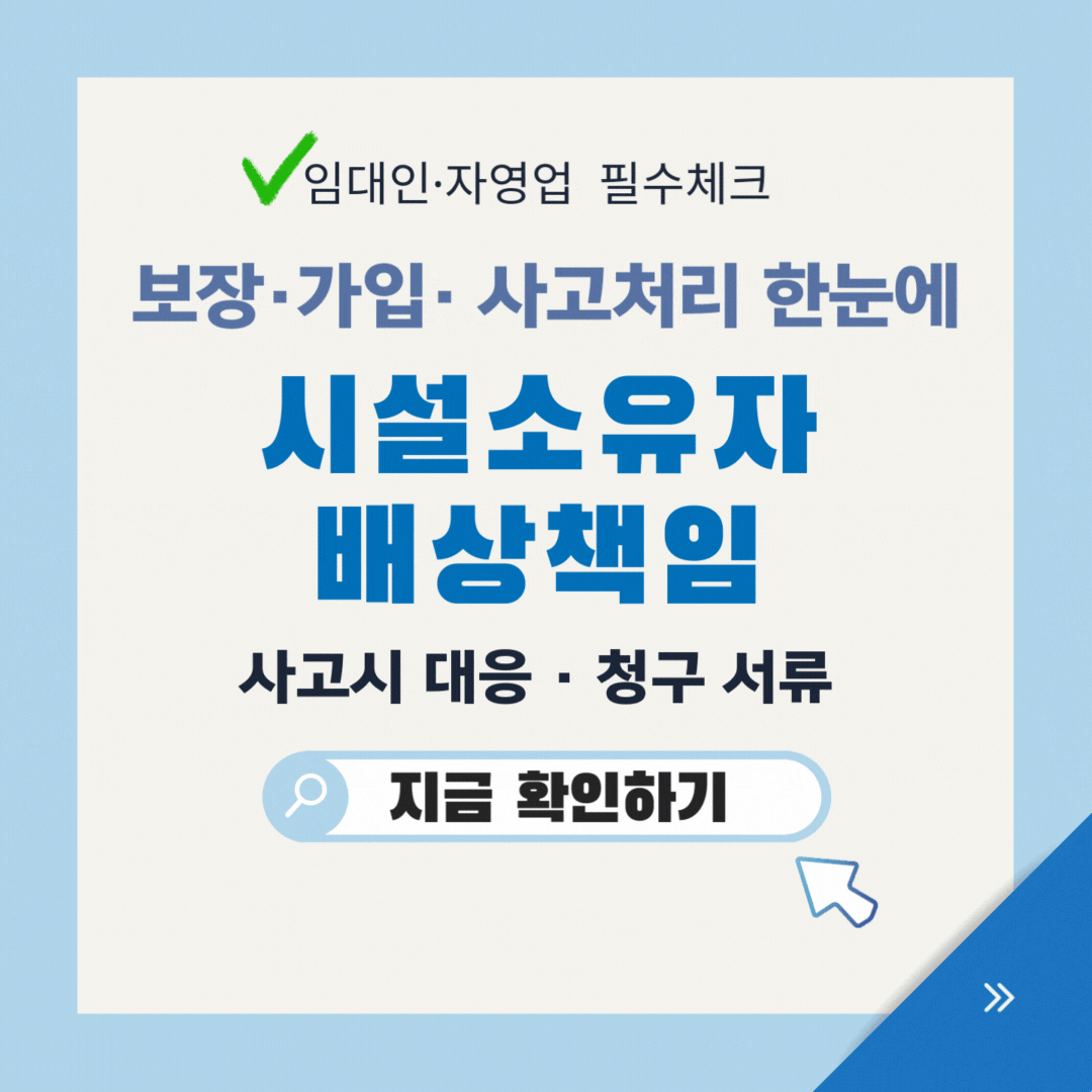 시설물배상책임보험 총정리. 민법 758조 근거, 실제 사고 사례, 소유자·관리자 책임 요건, 예외/감경, 가입대상 및 보험료, 예방 체크리스트, Q&A와 공식 링크 안내.