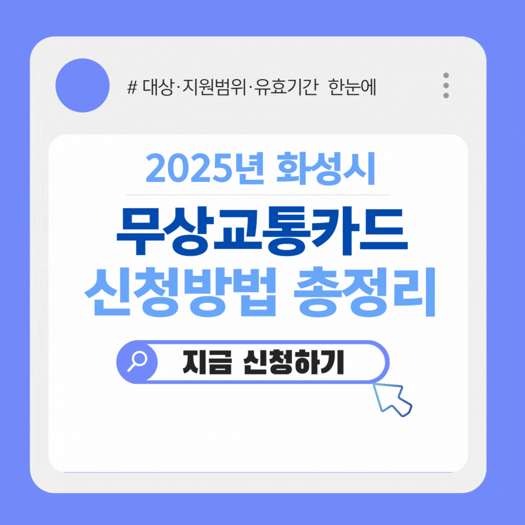2025 화성시 무상교통카드 신청 총정리. 화성시민 대상, 연령·소득별 차등 지원, 온라인·주민센터 신청, 교통카드 등록 필수, 매월 정산 후 지급.
